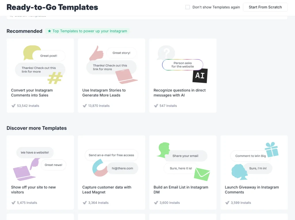 ☝️My tip: Two of my favorite pre-built templates include converting comments into sales and using Instagram stories to generate more leads. Both of these templates work by setting up a specific keyword that users comment or DM, triggering an automated message to their DMs and starting a conversation. I love using this method to offer a free ebook and collect email addresses quickly and efficiently.